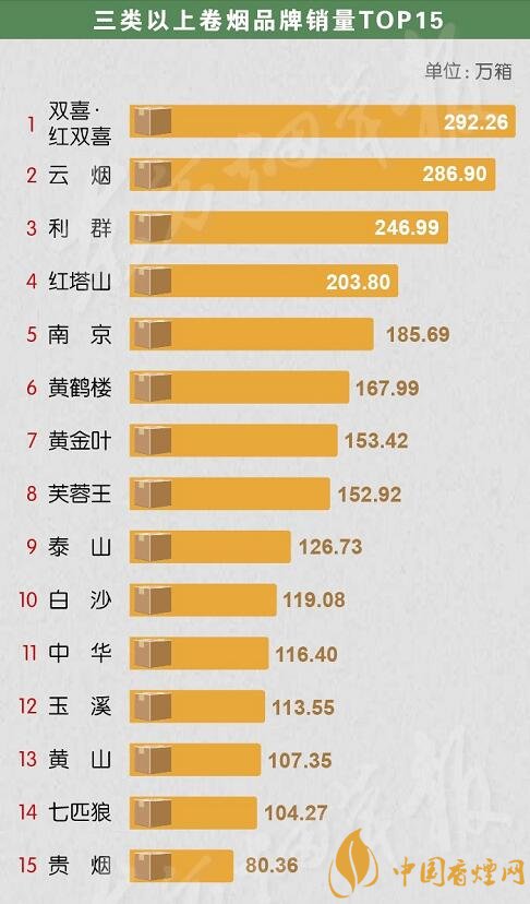 三類以上卷煙品牌銷量中,百年香煙品牌雙喜紅雙喜以微弱的優(yōu)勢位居榜首,云煙緊隨其后與排名第三的利群拉開差距。紅塔山、南京、黃鶴樓、黃金葉、芙蓉王分別位居4-8位,銷量也維持在一百五十萬箱以上,泰山、白沙、中華、玉溪、黃山、七匹狼、貴煙雖然銷量在一百五十萬箱以下,但都榜上有名,分別占據(jù)9-15位。一直以來,三類卷煙作為全國卷煙市場的中堅(jiān)力量,其市場份額之高、覆蓋面之廣、影響力之深,始終備受行業(yè)內(nèi)外的關(guān)注。