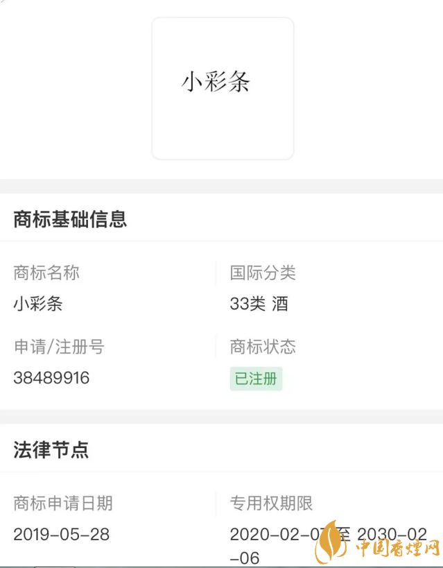 據(jù)了解,汽化酒這個項目,狼煙天下在2019年5月就開始立項了。還特意在33酒類申請了商標(biāo),商標(biāo)名字也叫做“小彩條”。