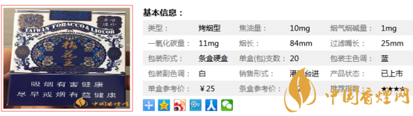梅花王使用云南和臺(tái)南的優(yōu)質(zhì)煙葉,種植及制作技術(shù)均以出品最地道的中式烤煙為首要標(biāo)準(zhǔn)。藍(lán)梅花王,這個(gè)煙嗅著有一股爆米花的味道,頭一次聞到有爆米花氣味的香煙。據(jù)香煙網(wǎng)小編市場(chǎng)調(diào)查,梅花王藍(lán)硬的售價(jià)為25元/包。