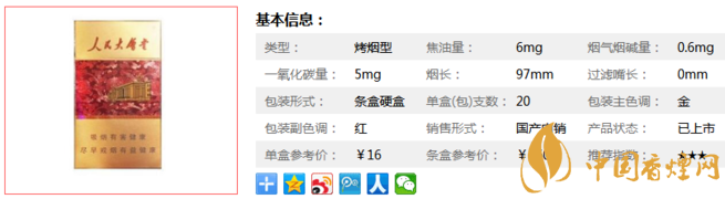 | 類型 :烤煙型 | 焦油量 :6mg | 煙氣煙堿量 :0.6mg | 一氧化碳量 :5mg |