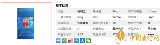 | 類型 :烤煙型 | 焦油量 :3mg | 煙氣煙堿量 :0.3mg | 一氧化碳量 :5mg |