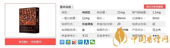 | 類型 :烤煙型 | 焦油量 :11mg | 煙氣煙堿量 :1.1mg | 一氧化碳量 :12mg |