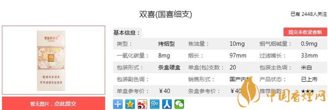 在品牌發(fā)展過(guò)程中,廣東“雙喜”逐漸形成了區(qū)域特色鮮明的“高香”風(fēng)格和貼近生活、貼近百姓的“喜文化”內(nèi)涵,深受華南地區(qū)廣大消費(fèi)者喜愛(ài)。香煙價(jià)位中等,但是質(zhì)量比較不錯(cuò),值得一品。經(jīng)香煙網(wǎng)小編市場(chǎng)調(diào)查雙喜國(guó)喜細(xì)支售價(jià)為40元/包。