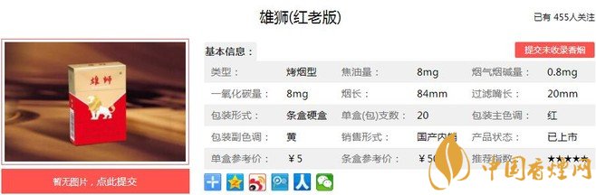 以上便是由香煙網(wǎng)小編為大家介紹的關(guān)于雄獅紅老版口感及參數(shù) 5元檔卷煙的領(lǐng)跑者的相關(guān)信息,想要了解更多有關(guān)內(nèi)容請點(diǎn)擊: 紅金龍硬曉樓價(jià)格及參數(shù) 紅金龍硬曉樓口感分析