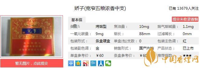 寬窄五糧濃香中支煙支長(zhǎng)88mm,水松紙上有兩排降焦孔,煙絲油潤(rùn)度不錯(cuò)但稍有碎末,切口整齊。煙支拿在手里十分精致舒適。下面我們一起來(lái)看寬窄五糧濃香中支的參數(shù)信息:焦油量:10mg 煙堿量:1.1mg 一氧化碳量:9mg