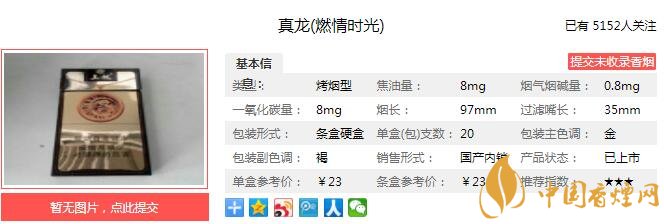 真龍燃情時光煙支長97mm,過濾嘴長35mm,采用硬盒特型盒型,細長而精致,煙支5.4mm直徑,充分表現(xiàn)成功商務人士的精致品位和生活方式。下面我們一起來看真龍燃情時光的參數(shù)信息:焦油量:8mg 煙堿量:0.8mg 一氧化碳量:8mg