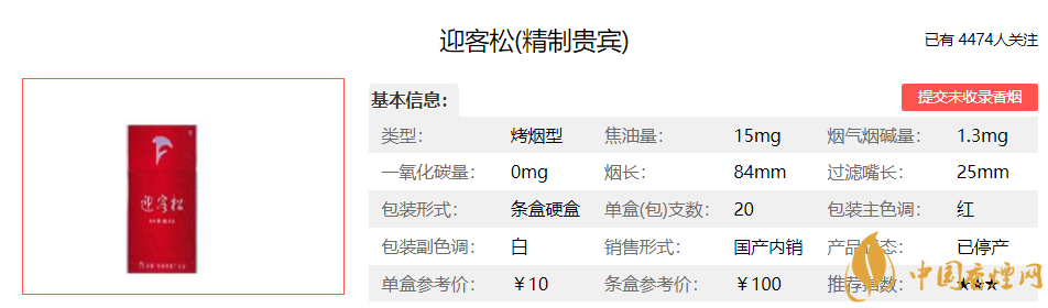 迎客松(精制貴賓)煙是安徽中煙工業(yè)有限責(zé)任公司旗下品牌迎客松香煙推出的一款焦油含量14mg的烤煙型香煙(俗名:Yingkesong Guibin)。 產(chǎn)品精選進(jìn)口煙葉和 優(yōu)質(zhì)云南煙葉作為配方主體。產(chǎn)品香氣清雅飄逸,口感清爽舒適,余味干凈。