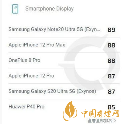 iPhone 12 手機(jī)的屏幕表現(xiàn),最終,以88分與一加8 Pro并列第二,列位榜首的目前是Note20 Ultra,分?jǐn)?shù)為89分。
