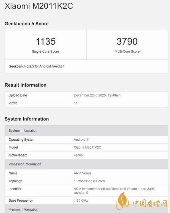 在小米官方宣布完小米11的發(fā)布時(shí)間之后,有博主對(duì)小米11再次開(kāi)啟了新一輪的細(xì)節(jié)爆料。數(shù)據(jù)顯示,小米11主頻可達(dá) 1804 MHz,擁有12GB運(yùn)存,運(yùn)行安卓 11,跑分的最高一次成績(jī)是 1135 的單核得分以及多核 3790 的多核得分。