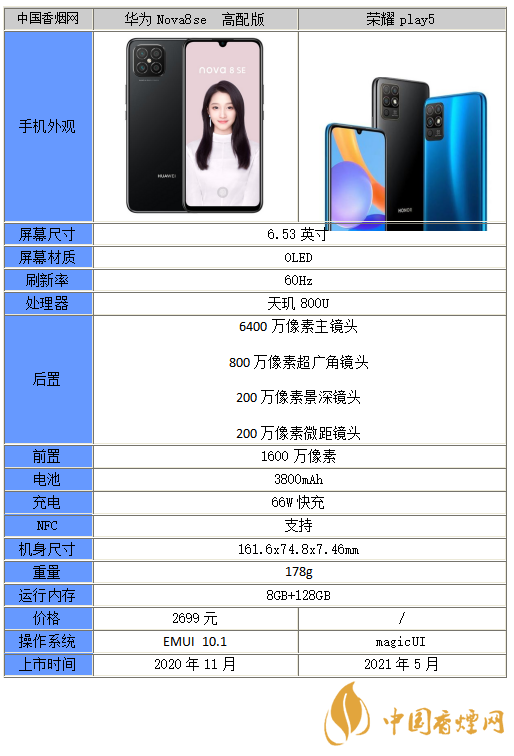 以上就是小編收集到的榮耀play5和華為nova8se高配版本區(qū)別在哪-應該買哪個的相關內容,以上內容均來源于網(wǎng)絡,僅供參考,一切以實際為準,更多最新數(shù)碼資訊請關注香煙網(wǎng)。