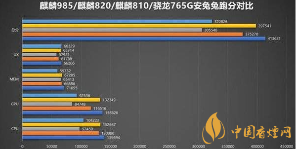 同時(shí)從麒麟985/麒麟820/麒麟810/驍龍765G安兔兔成績(jī)橫向?qū)Ρ葓D來看