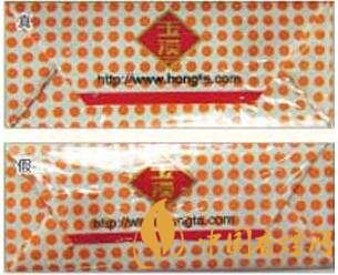 真煙的拉帶線為不干膠專用拉帶線,在紫外熒光燈的照射下會(huì)顯示紅色字母圖案,在正常光線下變換不同角度觀察時(shí)會(huì)變換出紫紅色;假煙的拉帶線均為普通拉帶線,生產(chǎn)工藝粗糙,不具備真煙拉帶線所呈現(xiàn)出來(lái)的特征及效果。