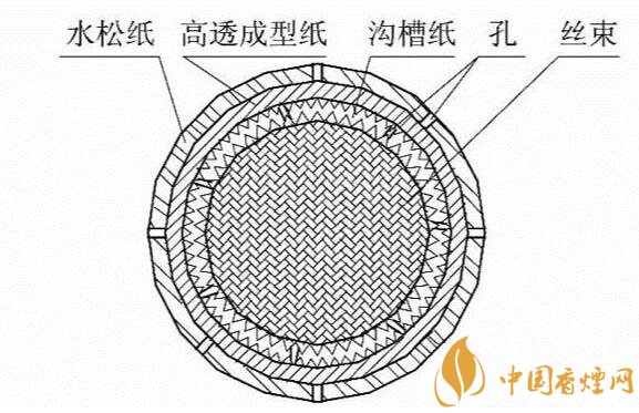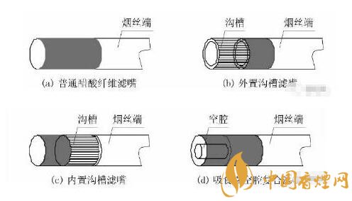 溝槽濾嘴:是一種由于特殊結構的溝槽純纖維紙包囊醋酸纖維絲束濾芯制成。簡單來說,就是在醋酸濾芯的外圍先包覆一層溝槽纖維素紙,然后包裹一層成形紙而成。溝槽纖維素紙的表面是通長的溝槽段或者是溝槽段和平坦段組合構成。其作用一方面可以有效減小吸阻提高通透感。另一方面增大煙氣與濾嘴的接觸的表面積,快速降低煙氣溫度和增加對煙氣有害物質的過濾和吸附。