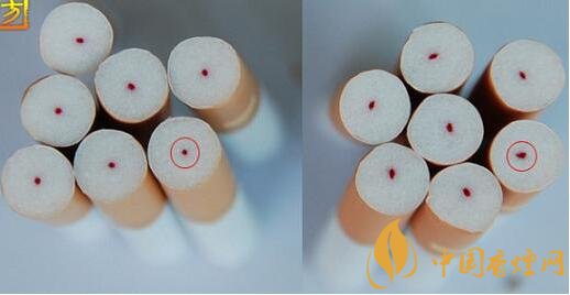 如圖五、圖六紅框標(biāo)注所示,真煙的HCF過濾纖維(俗稱紅線)位于嘴棒中央,側(cè)面呈規(guī)則圓形,假煙則形狀各異參差不齊。有些假煙,中間的紅點是印刷上去的。