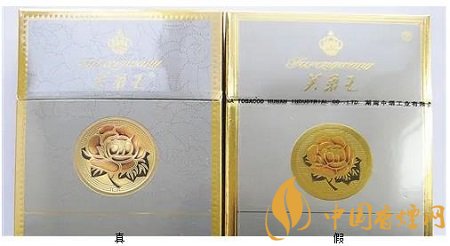 真品卷煙“芙蓉花”圖案立體感強(qiáng),金色長(zhǎng)方形外邊框上有均勻的細(xì)小壓痕。