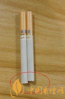 左邊真煙金色圓圈部位與煙嘴結(jié)合比較完美,毫無(wú)縫隙,而且色澤靚麗印刷不拖泥帶水,細(xì)看右邊的金色圓圈與煙嘴結(jié)合空隙較大,中間居然脫節(jié)了。而且光圈也比較粗糙。