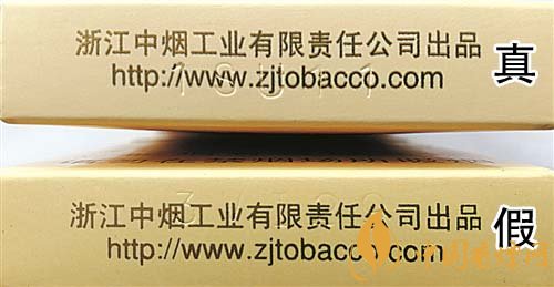 3.小盒底部鋼印差異對比:真煙鋼印為機器動態(tài)打印,整體鋼印較深、間距不等,其位置與企業(yè)網(wǎng)址重疊;假煙鋼印一般為手工靜態(tài)打印,鋼印較淺,位置與文字重疊。