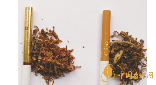 煙絲差異對比:真煙煙絲切絲寬度均勻,煙絲疏松、光澤油潤性好,呈檸檬黃色,煙絲結構為純葉絲;假煙煙絲切絲寬度不勻,光澤油潤性較差,煙絲結構為葉絲和少量梗絲,與真品特征存在明顯差異。