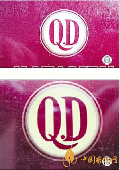3.真品卷煙條盒和小盒正面QD處,用珠光黃油墨印刷,變換角度,QD處黃色部分由黃色轉(zhuǎn)變?yōu)闇\黃色,假冒卷煙不變色。