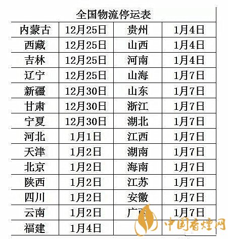 但今年的寒冷天氣侵襲嚴重,大風(fēng)降溫影響顯著,加之重污染天氣預(yù)警較為頻繁的影響,以及2019年大部分地區(qū)的初雪也都來得比較早,物流問題面臨著嚴重的考驗,因此不少地區(qū)的物流公司的假期也提前了,全國物流停運時間已經(jīng)確定。