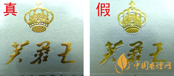 ①開蓋處“芙蓉王”及王冠圖案印刷:真品卷煙燙金定位準(zhǔn)確,套色均勻,凹凸明顯,印刷工藝精細(xì);假冒卷煙燙金定位不準(zhǔn),脫漆脫色嚴(yán)重,印刷工藝粗糙。