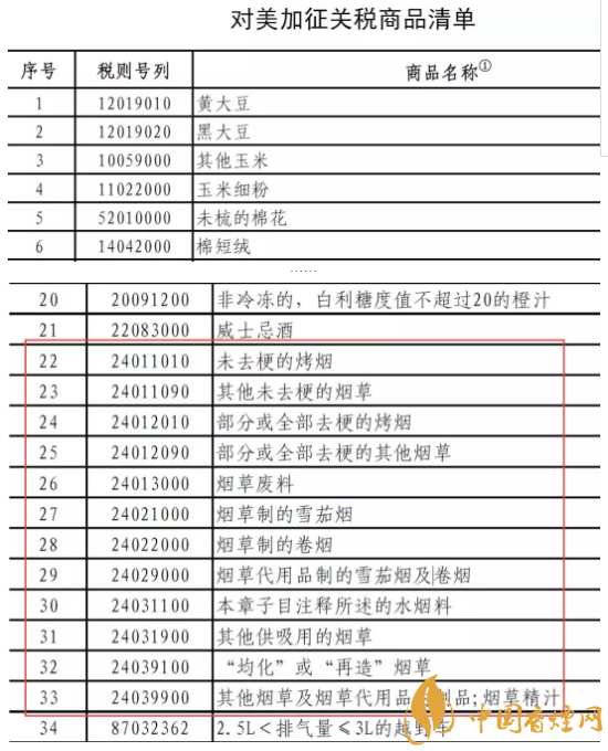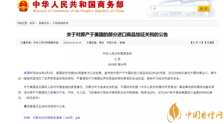 隨著中美貿易戰(zhàn)的不斷升級,從受限清單的第一頁,煙民們酒看到了煙草生產過程中涉及的未去??緹煛⑵渌ス煵?、煙草制的雪茄煙、煙草制的卷煙等產品。為捍衛(wèi)中方自身合法權益,中國政府依據《中華人民共和國對外貿易法》等法律法規(guī)和國際法基本原則,對原產于美國的進口商品對等采取加征關稅措施,稅率為25%,涉及2017年中國自美國進口金額約500億美元。