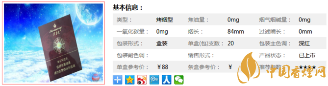 類型 :烤煙型 焦油量 :9mg 煙氣煙堿量 :0.9mg 一氧化碳量 :9mg