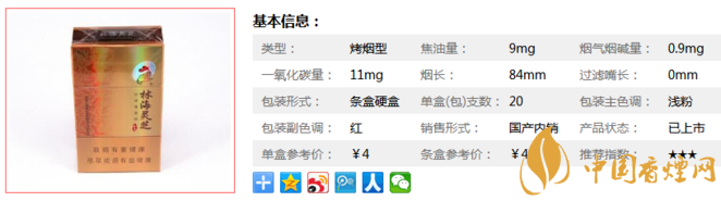 | 類型 :烤煙型 | 焦油量 :9mg | 煙氣煙堿量 :0.9mg | 一氧化碳量 :11mg |
