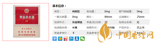 類型 :烤煙型 焦油量 :10mg 煙氣煙堿量 :1mg 一氧化碳量 :11mg