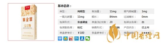 類型 :烤煙型 焦油量 :11mg 煙氣煙堿量 :1mg 一氧化碳量 :11mg