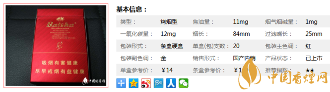 該產(chǎn)品選用醇化而具有獨特香氣的國內(nèi)外優(yōu)質原料,輔于天然植物精華香精香料,依托紅塔集團技術中心雄厚的技術力量,運用當前業(yè)內(nèi)先進的生物減害制劑和激光打孔技術,突出“高科技、高香氣、低焦油、低危害”的風格特點。下面我們一起來看白沙尚品紅的參數(shù)信息:焦油量:11mg. 煙堿量:1mg. 一氧化碳量:12mg.