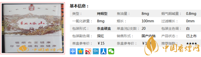 | 類型 :烤煙型 | 焦油量 :8mg | 煙氣煙堿量 :0.8mg | 一氧化碳量 :8mg |