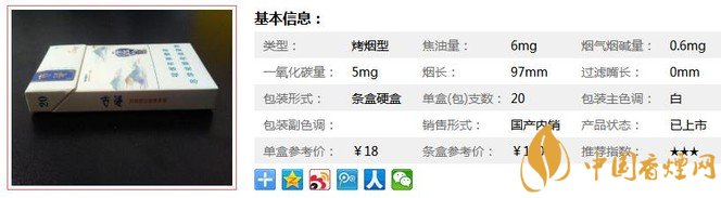 | 類型 :烤煙型 | 焦油量 :6mg | 煙氣煙堿量 :0.6mg | 一氧化碳量 :5mg |