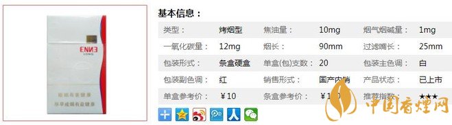 | 類(lèi)型 :烤煙型 | 焦油量 :10mg | 煙氣煙堿量 :1mg | 一氧化碳量 :11mg |
