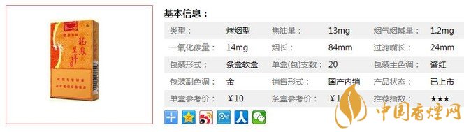 類(lèi)型 :烤煙型 焦油量 :13mg 煙氣煙堿量 :1.2mg 一氧化碳量 :14mg