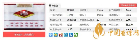 類型 :烤煙型 焦油量 :10mg 煙氣煙堿量 :1mg 一氧化碳量 :11mg