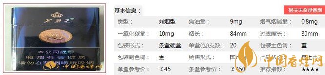 | 類型 :烤煙型 | 焦油量 :9mg | 煙氣煙堿量 :0.8mg | 一氧化碳量 :10mg |