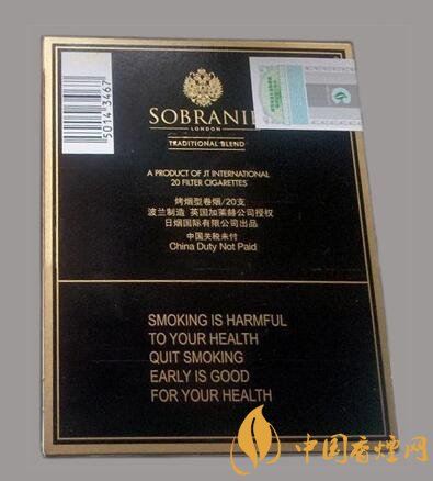 包裝采用了黑色為底色,顏色較偏暗,以金色為輔。金色logo立于正面其上,相當(dāng)醒目。logo之下為SOBRANIIE幾個字母,最下面為警示語“吸煙有害健康盡早戒煙有益健康”,顯眼奪目,立體感很強(qiáng),磨砂手感,既炫且酷,包裝精美大氣。