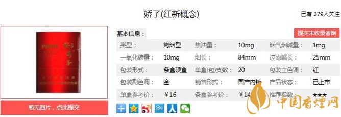 嬌子紅新概念煙支長84mm,過濾嘴長25mm,該產(chǎn)品在運(yùn)用傳統(tǒng)的葉組配方降焦技術(shù)和卷煙紙降焦技術(shù)的基礎(chǔ)上,成功地集成應(yīng)用了復(fù)合生化制劑減害材料這項(xiàng)具有川渝公司自主知識產(chǎn)權(quán)的核心減害技術(shù)。下面我們一起來看嬌子紅新概念的參數(shù)信息:焦油量:10mg 煙堿量:1.0mg 一氧化碳量:10mg