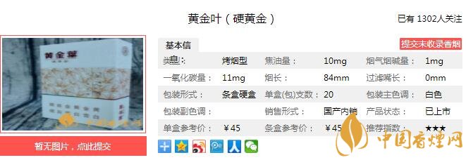 內(nèi)在設(shè)計延續(xù)黃金葉濃香品類技術(shù)特色,突出 “醇香”風(fēng)格,秉承“平衡與協(xié)調(diào)”設(shè)計理念,通過產(chǎn)品葉組配方設(shè)計、加香加料設(shè)計和卷煙材料的配套設(shè)計,注重保持產(chǎn)品香氣、濃度的同時,提高口感的舒適度和煙氣的輕松感。香氣醇和優(yōu)雅,煙氣凈甜舒爽,突出自然流暢,輕松愉悅。經(jīng)香煙網(wǎng)小編市場調(diào)查黃金葉硬黃金售價為45元/包。