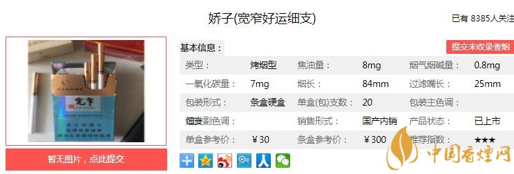 嬌子寬窄好運細(xì)支煙支長84mm,過濾嘴長32mm,“寬窄”專線生產(chǎn),管理精細(xì)、標(biāo)準(zhǔn)精確、加工精準(zhǔn)、制造精心。煙葉色澤均勻,填充比較緊實,煙紙為圓紋造型。下面我們一起來看嬌子寬窄好運細(xì)支的參數(shù)信息:焦油量:8mg 煙堿量:0.8mg 一氧化碳量:7mg