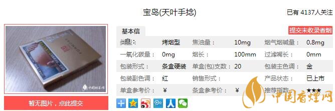 以上便是由香煙網(wǎng)小編為大家介紹的關(guān)于寶島天葉手捻多少錢一包 為大陸游客設(shè)計的旅游煙的相關(guān)信息,想要了解更多有關(guān)內(nèi)容請點擊:嬌子紅傳奇天子多少錢一包 紅傳奇口感及參數(shù)介紹