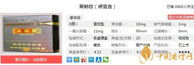 黃鶴樓硬雪香煙支長90mm,過濾嘴長35mm,產品定位為中支煙。煙支煙嘴均為代表雪茄的咖啡色,莊重經典。煙支切割平整,干凈整潔,煙絲填充均勻。下面我們一起來看黃鶴樓硬雪香的參數信息:焦油量:10mg 煙堿量:1.0mg 一氧化碳量:11mg