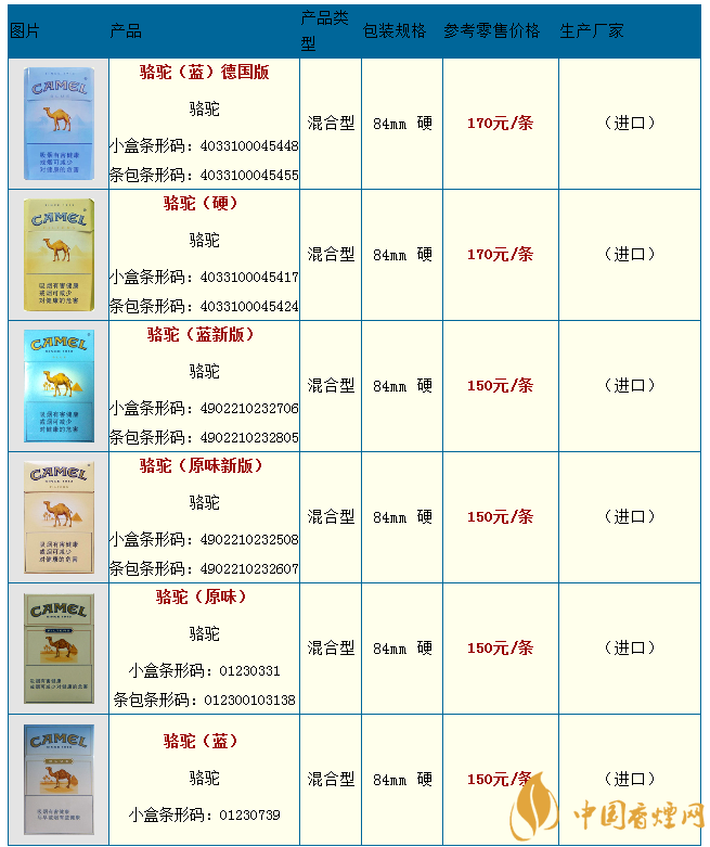 駱駝香煙品種包括了,駱駝(無(wú)嘴)、駱駝(軟黃)、駱駝(原味中免)、駱駝(藍(lán)中免)、駱駝(薄荷)、駱駝(特醇俄版)、駱駝(八角藍(lán))、駱駝(硬藍(lán)99s)、駱駝(硬黃99s)等。