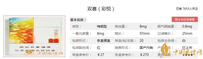 這款煙在廣東反而不多見,包裝簡約之中有炫目多彩的時(shí)尚氣息。雙喜彩悅沒有降低煙氣的凹槽,也無兩排細(xì)細(xì)的降焦線,絕對(duì)的素面朝天。香煙價(jià)位中等,但是質(zhì)量比較不錯(cuò),值得一品。經(jīng)調(diào)查雙喜彩悅售價(jià)為27元/包。