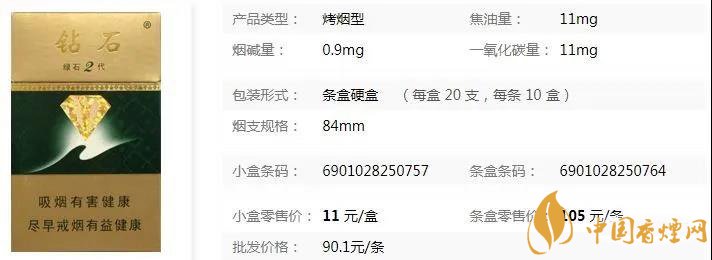鉆石(綠石2代)外觀包裝精美,個性化的煙支也如出一轍,煙絲金黃,煙灰雪白雪白的,特別的漂亮,它的品吸感醇香,但吸味純凈度稍遜色些。燃燒均勻充分,煙氣并不飽滿,吸食有些許的煙阻。煙草的本香味突出,煙支上散發(fā)著淡淡的花香,整體評價在10元檔的香煙中,只能算中上品質(zhì),口感一般,可偶作調(diào)劑之用。