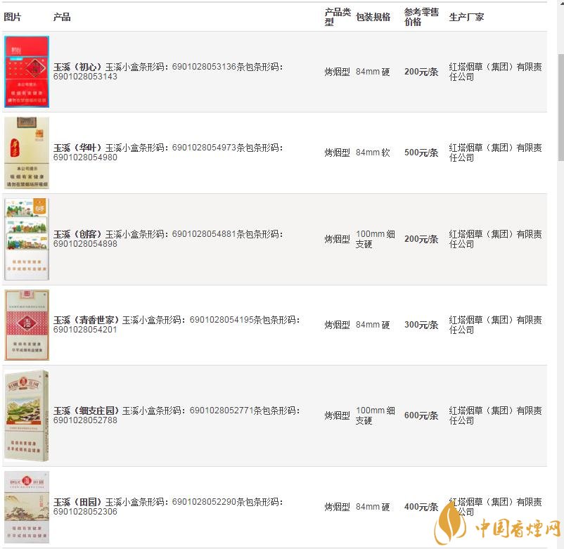 玉溪煙價(jià)格表和圖片大全