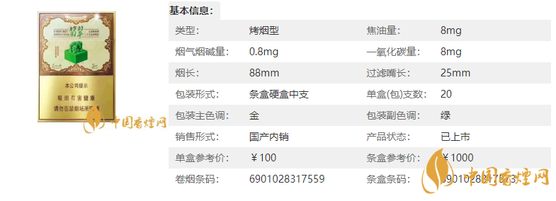 | 煙長:88mm | 過濾嘴長:25mm | 包裝形式:條盒硬盒 | 單盒(包)支數(shù):20 |