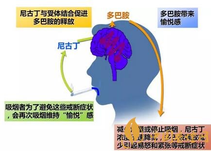 吸煙讓人興奮甚至成癮的源頭在于煙草中的尼古丁,吸煙后尼古丁進入體內(nèi),會經(jīng)由血液傳送,大約7秒即可到達腦部。尼古丁與大腦的乙酰膽堿α4β2受體結(jié)合后,會激活大腦的“獎勵中心”,釋放大量的多巴胺,多巴胺是一種促進人體腎上腺素分泌的神經(jīng)遞質(zhì),其濃度的提高是人感到開心、興奮等情緒的來源。