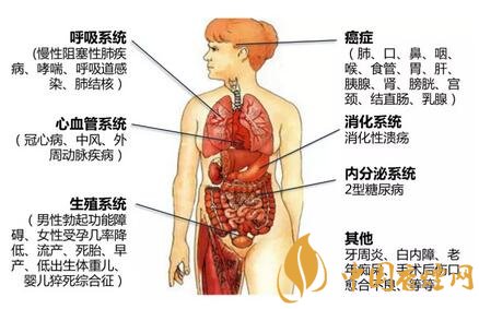 吸煙和疾病的關(guān)聯(lián)體現(xiàn)在方方面面,其中以癌癥、呼吸系統(tǒng)疾病以及心血管疾病最為常見。